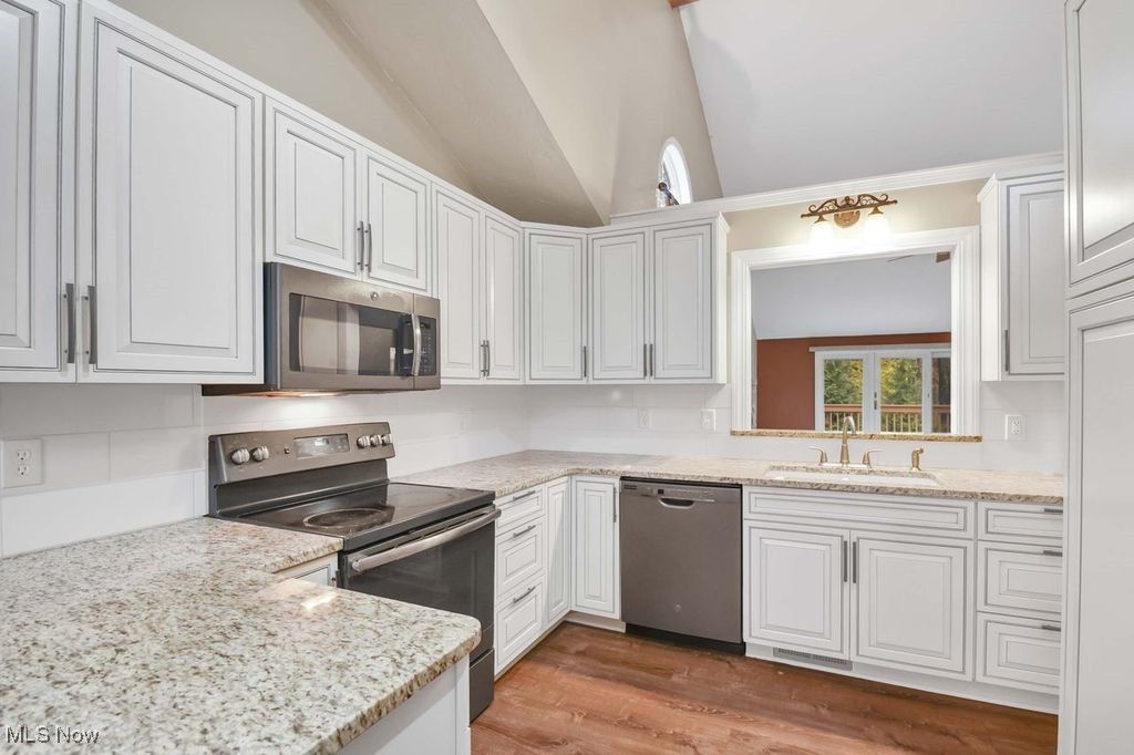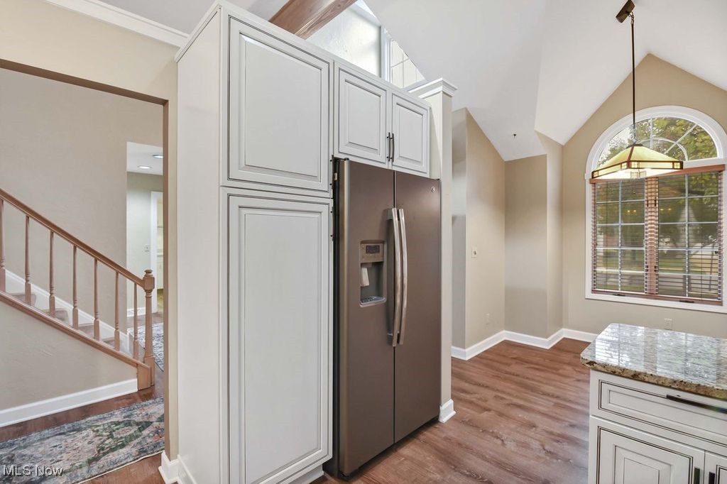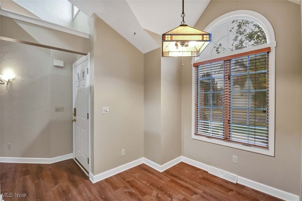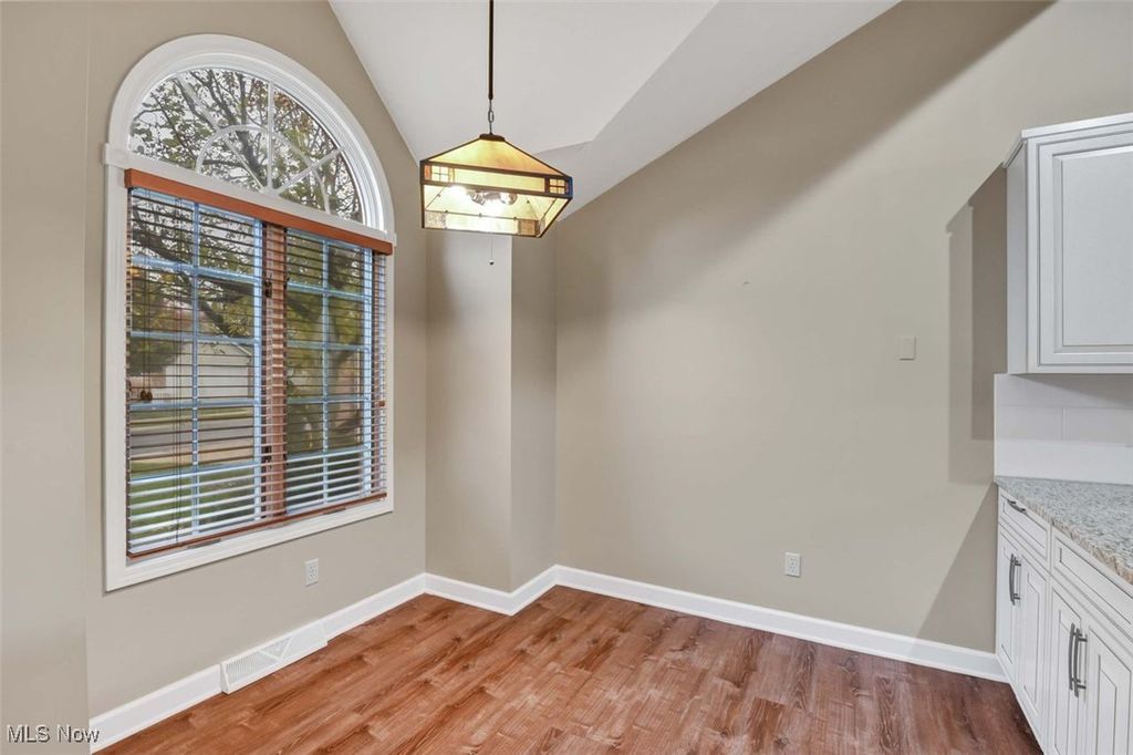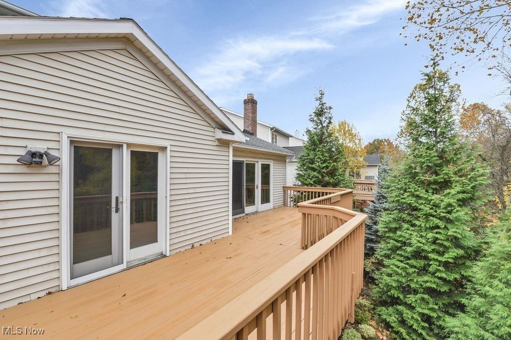 This stunning three-bedroom, three-and-a-half-bathroom home offers a perfect blend of modern updates and spacious living. Upon entering, you'll notice the newer luxury vinyl flooring in the foyer, kitchen, dining room, and laundry room, creating a fresh and cohesive look throughout the main floor. The gorgeously updated kitchen is a chef's dream, featuring newer high-end appliances, elegant cabinets, and granite countertops. Its open-concept design flows seamlessly into the spacious living room, which boasts a vaulted ceiling, a striking stone gas fireplace, and access to a large walkout deck overlooking peaceful, serene views - ideal for relaxing or entertaining. The main floor also includes a generously sized master bedroom with a huge full bathroom, a convenient half bath, and a main-floor laundry room for added functionality. The finished basement provides versatile space perfect for recreation or entertaining, with an additional fourth bedroom or office to suit your needs. Upstairs, the second level houses two spacious bedrooms and a full bathroom, offering comfort and privacy for family or guests. This home combines style, comfort, and practicality, making it an exceptional place to live